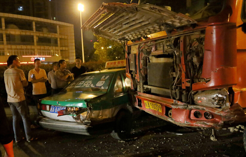 據(jù)報(bào)道,2015年9月13日晚上10點(diǎn)左右,安徽合肥,在習(xí)友路與懷寧路交口發(fā)生一起交通事故。一名被撞出租車的司機(jī)回憶,當(dāng)時(shí)他駕駛車輛排隊(duì)??吭谑致房谵D(zhuǎn)彎區(qū)域,正準(zhǔn)備由西向北左轉(zhuǎn)彎時(shí),突然一輛渣土車由東向西迎面行駛而來,由于速度較快,將他的車和另外4輛車撞在一起,其中兩輛出租車被撞得一頭“扎”進(jìn)綠化帶,被撞車輛出現(xiàn)不同程度損壞,但未造成人員傷亡。